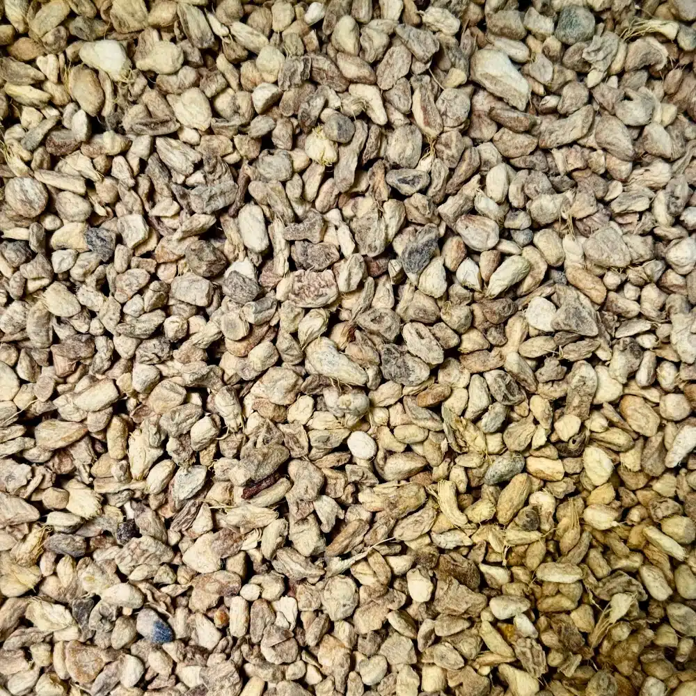 Le gingembre concassé bio se présente sous la forme de petits morceaux irréguliers de gingembre séché et déshydraté. Il a une couleur jaune pâle à beige et une texture légèrement fibreuse.